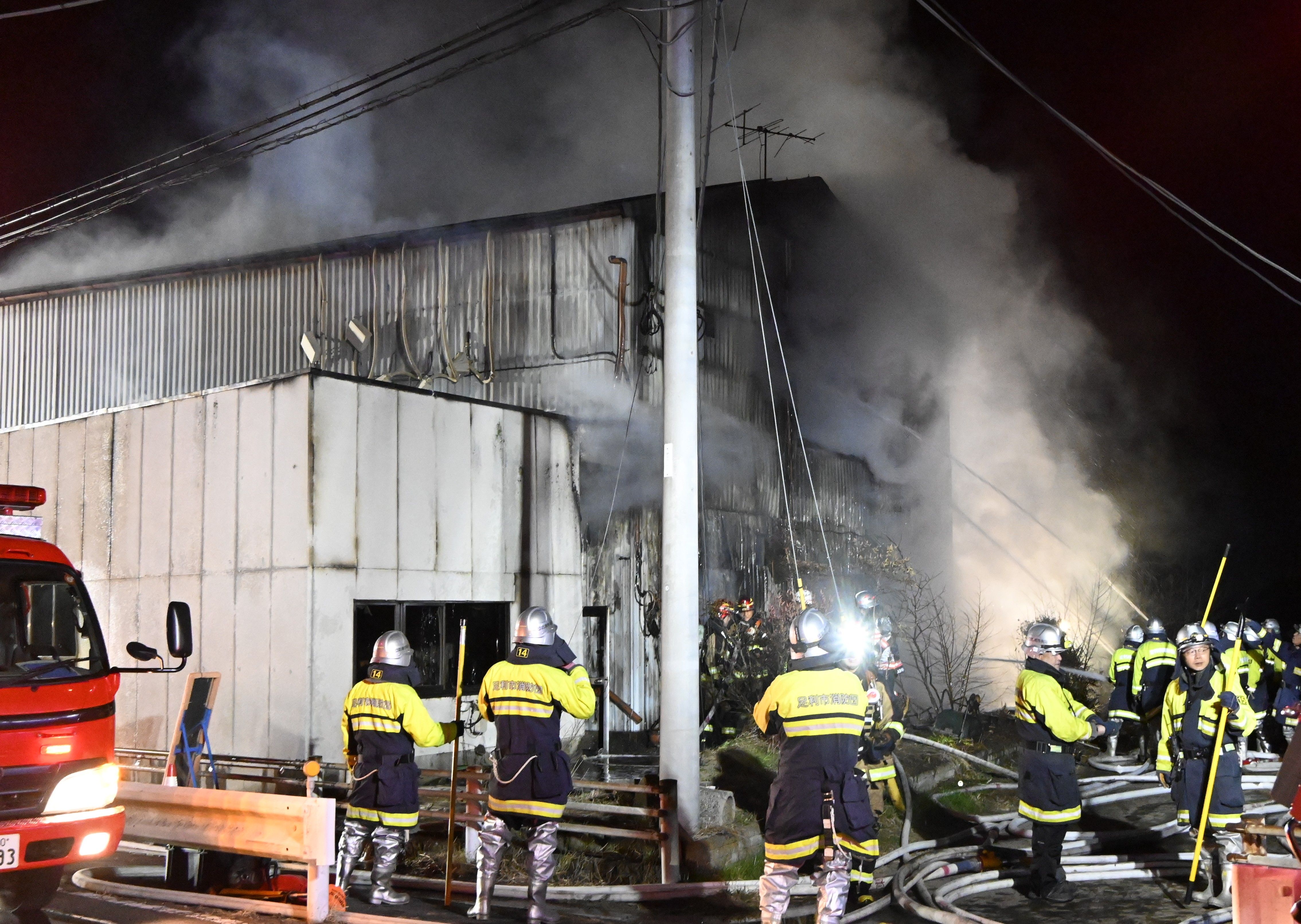 会社建物を焼いた火災現場=14日午後7時15分、足利市久保田町