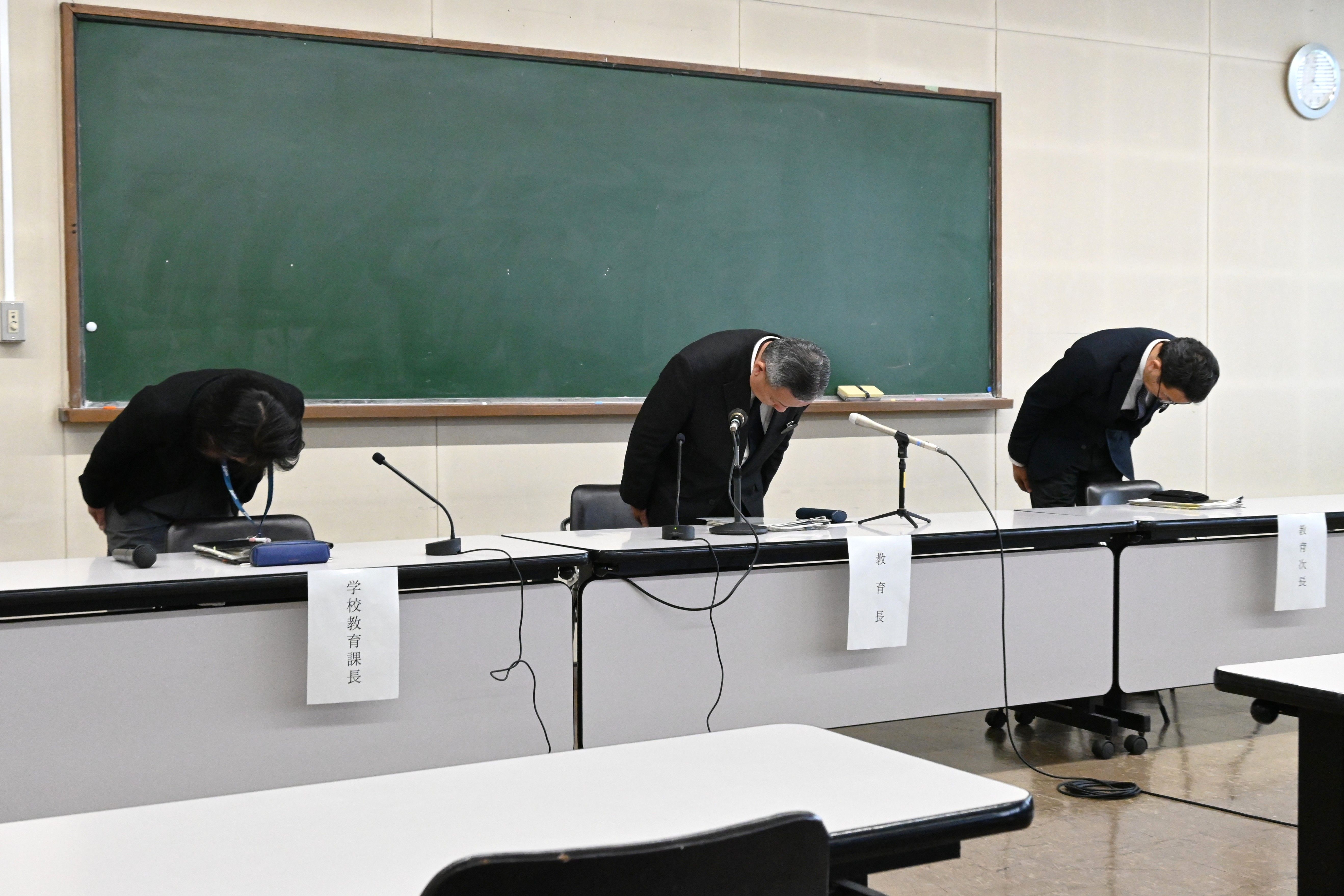会見冒頭、頭を下げる足利市教委幹部ら=3日午後4時、足利市教育庁舎