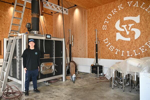 オランダ製の蒸留設備を備えたストークバレー蒸溜所内に立つ安井専務=小山市