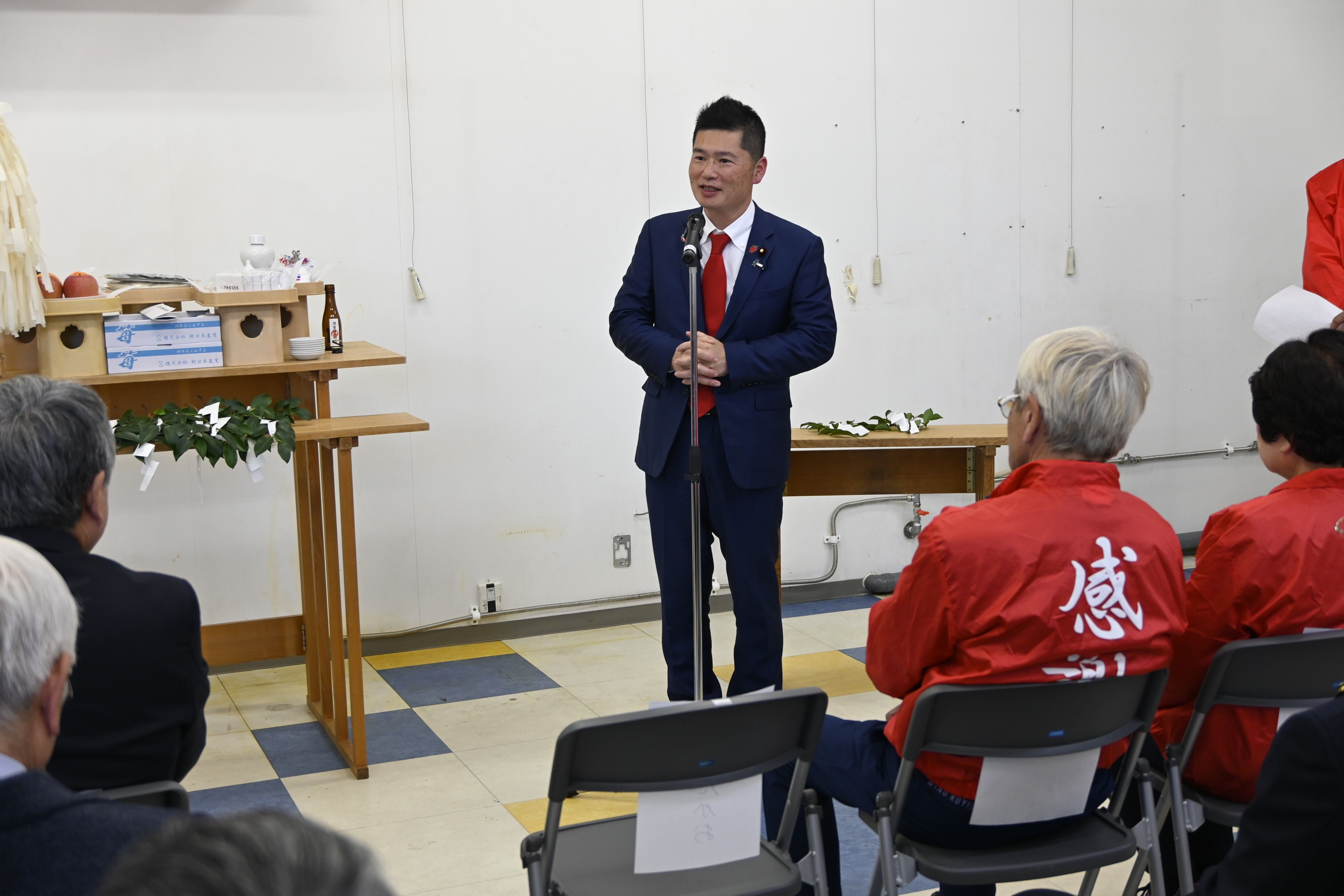 事務所開きで決意を述べる藤岡氏=22日午後、小山市駅南町1丁目