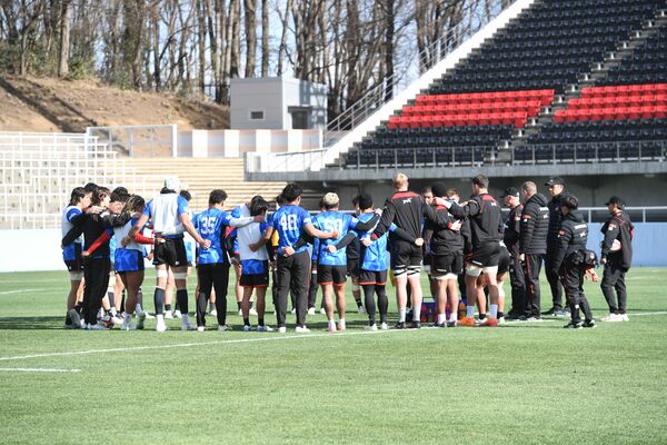 練習後に円陣を組むホンダヒートの選手ら。本県初戦に向け、黒色の観客席の一部が赤色に変えられた=22日午前、ホンダヒート・グリーンスタジアム