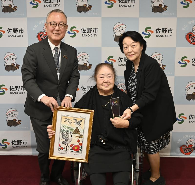 塗り絵のN-1グランプリで大賞に輝いた平塚さん(中央)