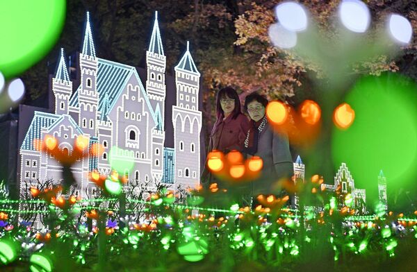グリムの森を華やかに彩るイルミネーション=28日午後6時30分、下野市下古山