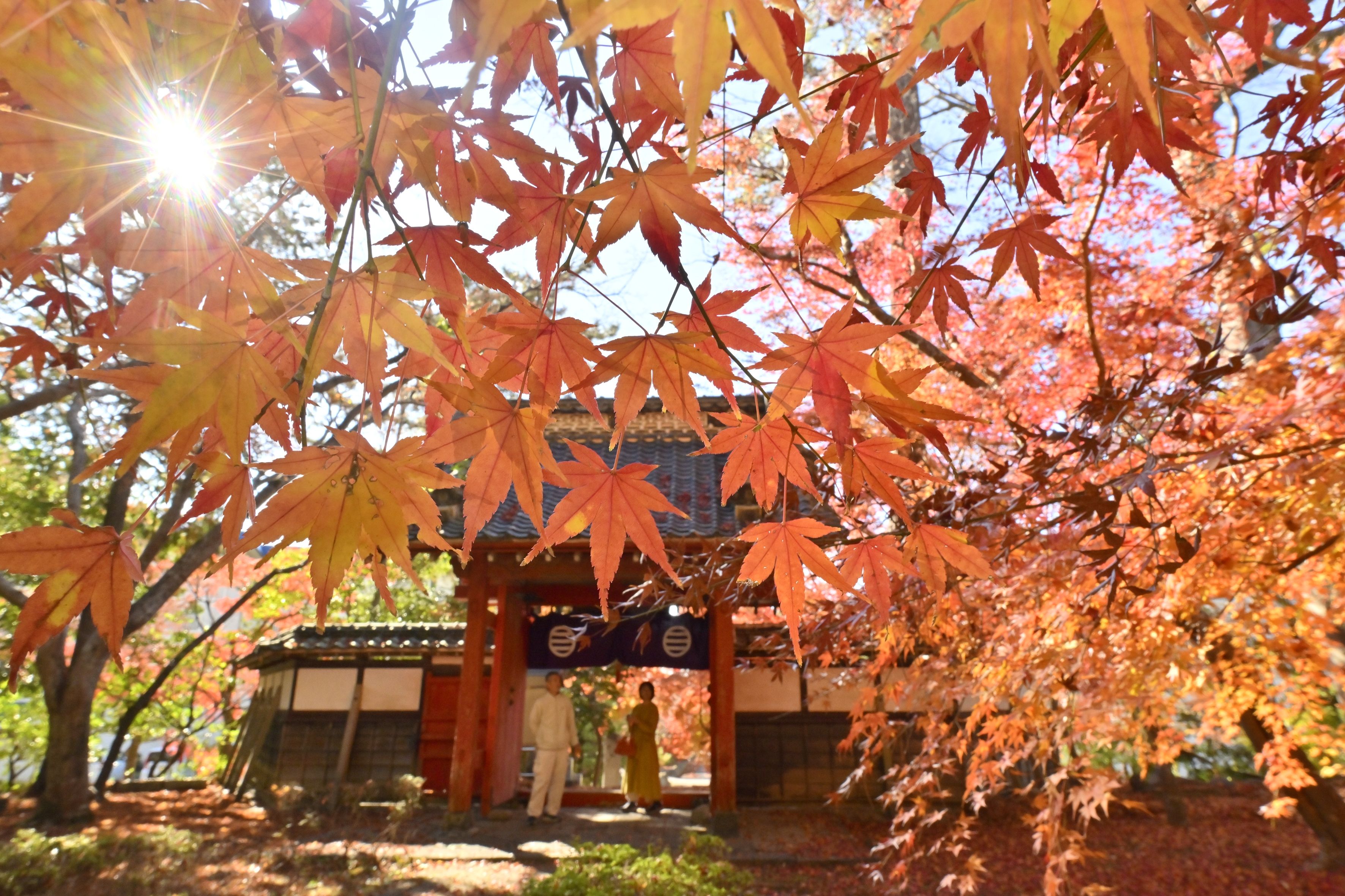 山門周辺を真っ赤に染め上げるヤマモミジ=26日午前11時45分、足利市山川町