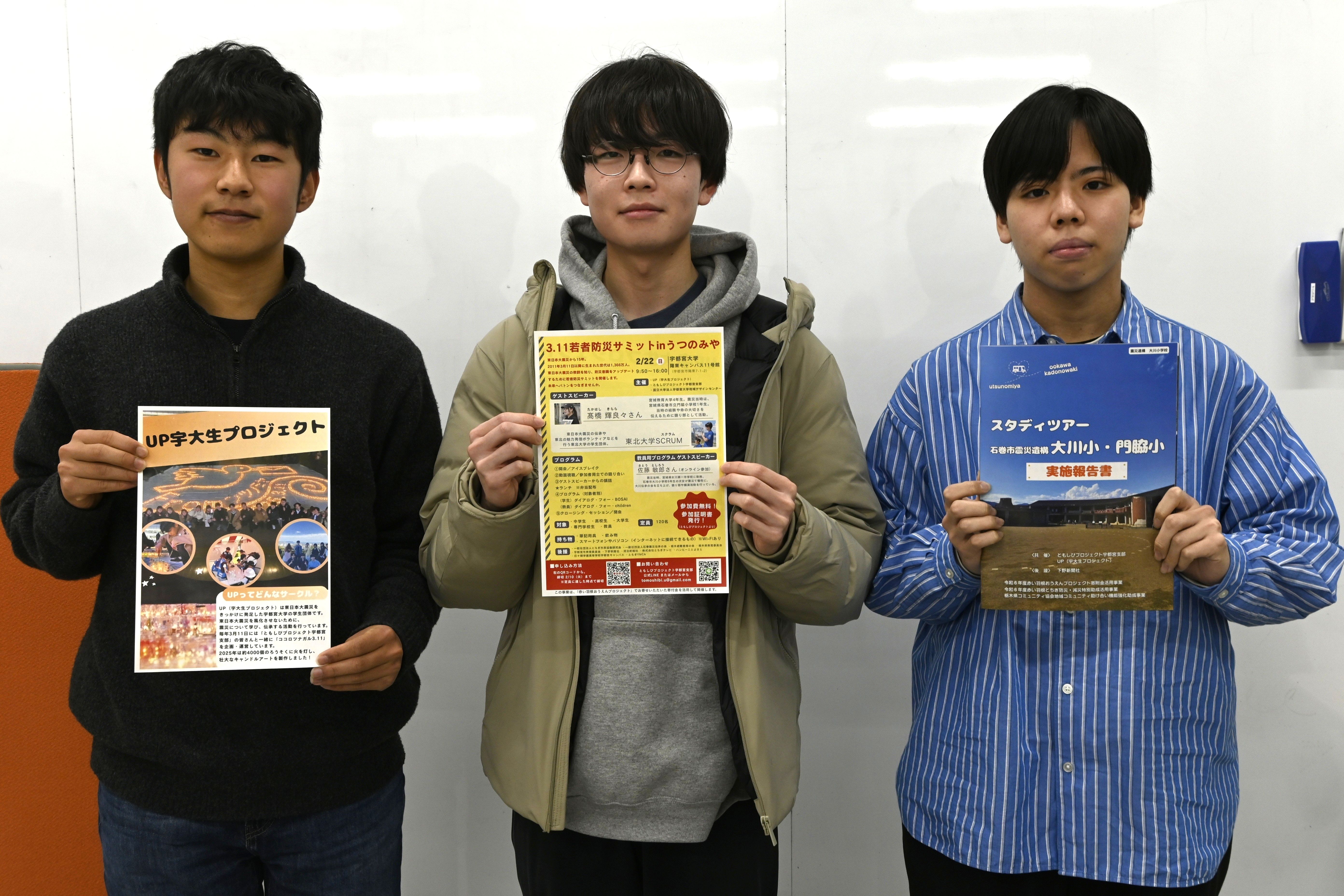 若者防災サミットへの参加を呼びかけるUPの加藤代表(中央)ら=1月下旬、宇都宮市陽東7丁目