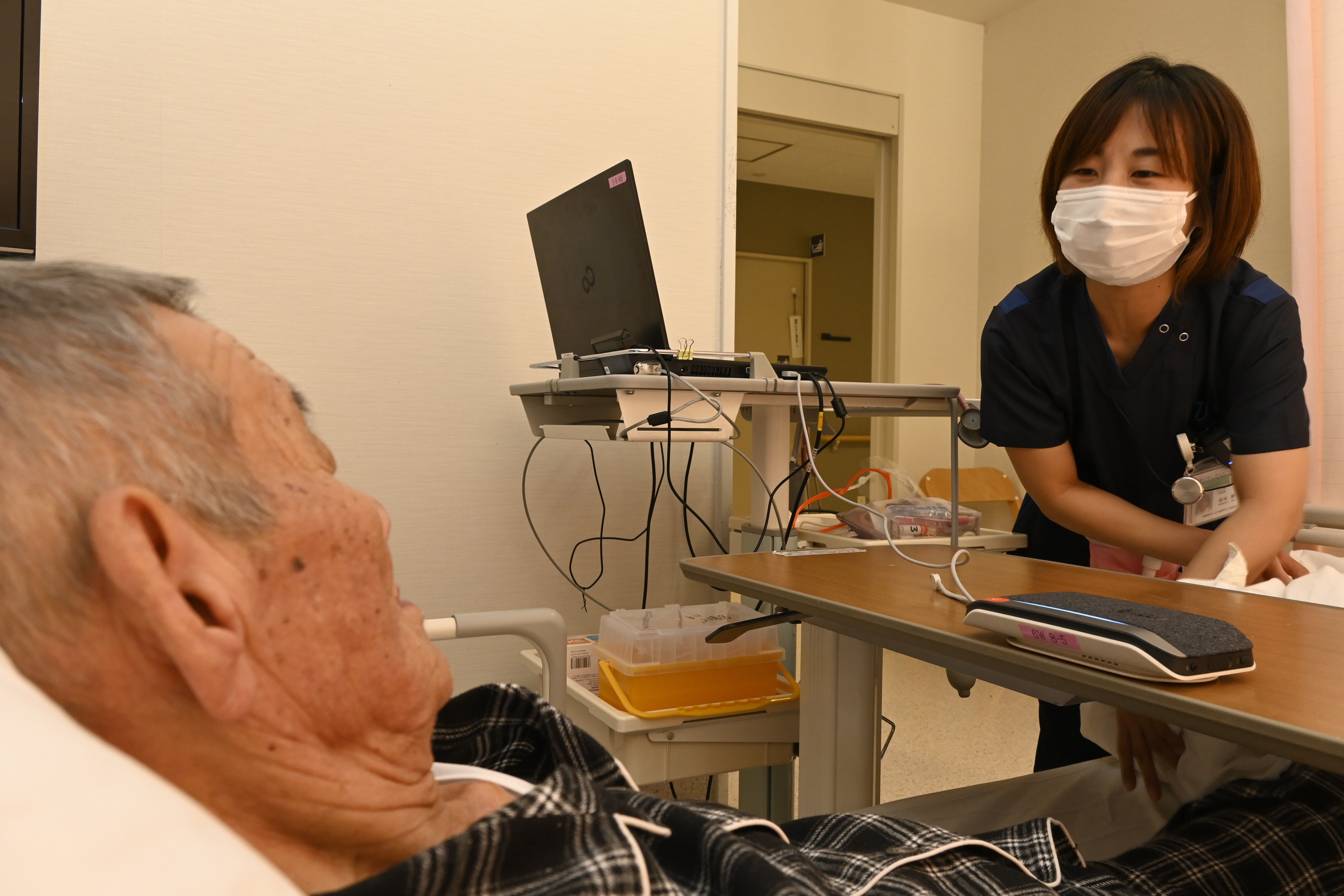 患者に容体を尋ねる看護師(右)。会話はマイク機器(右手前)を通じて自動で文字に起こされる=とちぎメディカルセンターしもつが