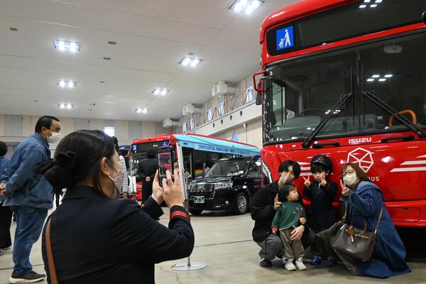 乗務員の服を着てバスの前で記念撮影する来場者ら=24日午後、宇都宮市元今泉6丁目