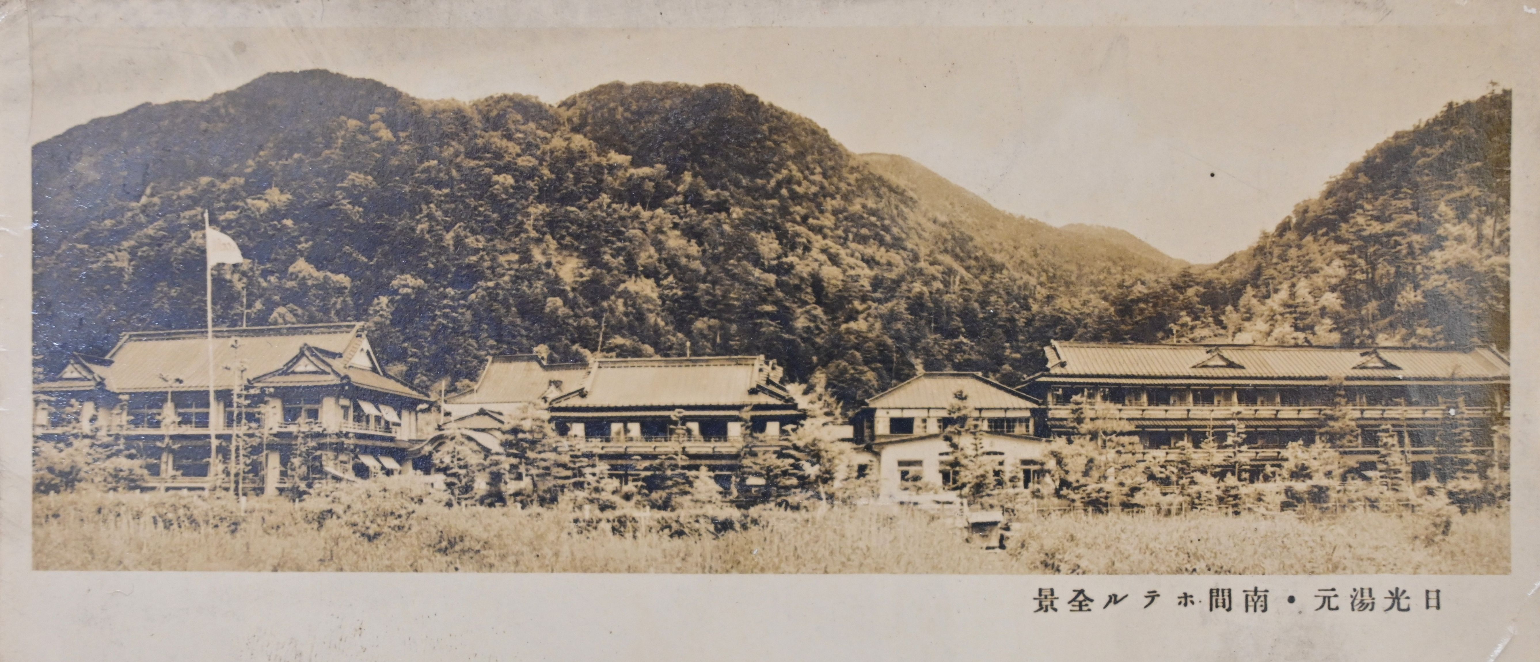 奥日光の湯元にあった南間ホテル全景が写った絵はがきの一部。左の建物が第2別館とみられる(日光市図書館蔵)