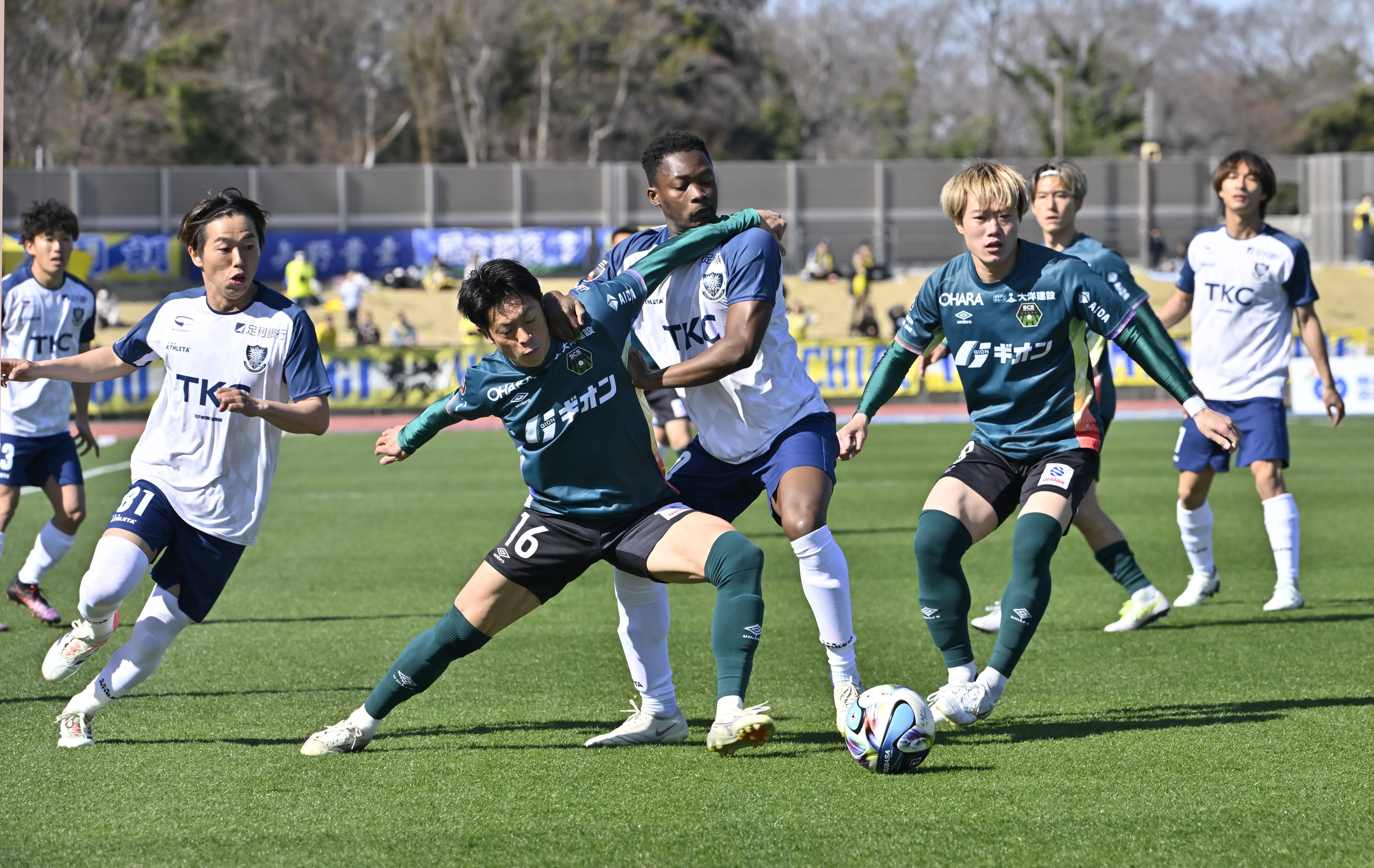 後半44分、栃木シティのMF森(中央)が空中で相手と競り合う=CFS、森田大地撮影