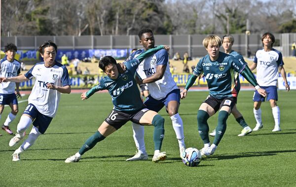 前半2分、栃木SCのFWケネス(中央右)が相手と競り合う=相模原ギオンスタジアム、広瀬華撮影
