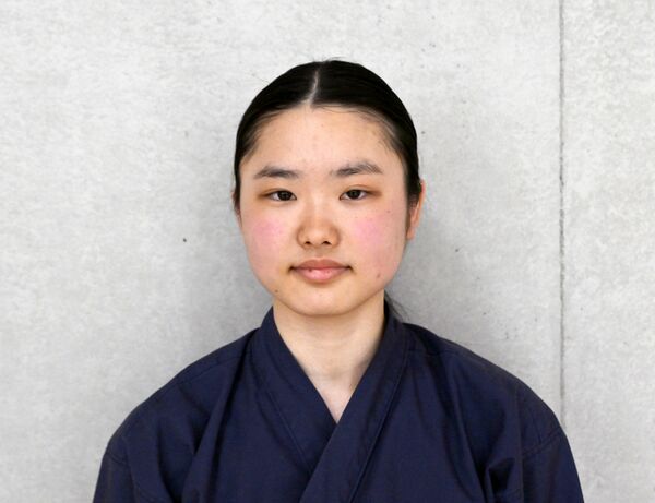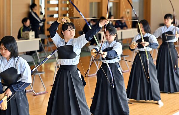 女子団体決勝で弓を引く足大付Aの広瀬(左から2人目)ら=ユウケイ武道館弓道場
