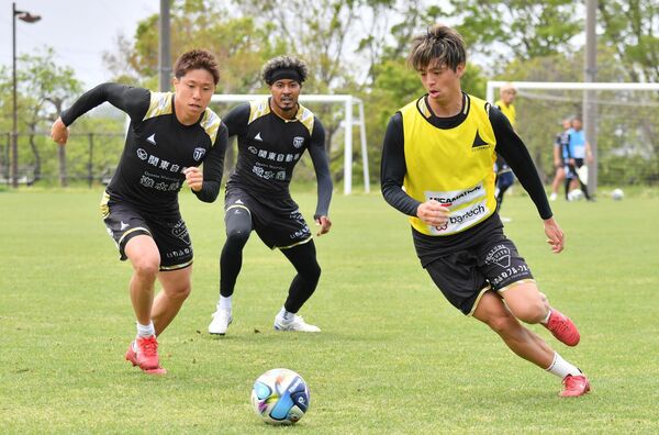 栃木ダービーに向け、練習から激しくボールを奪い合う栃木SCの選手たち=22日、さくら市のさくらスタジアム