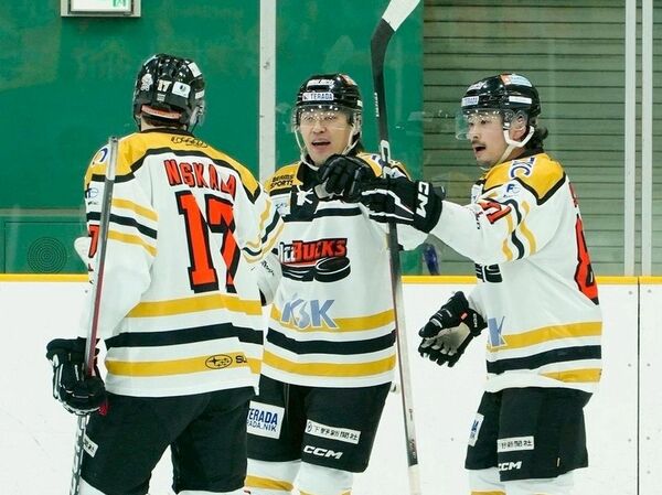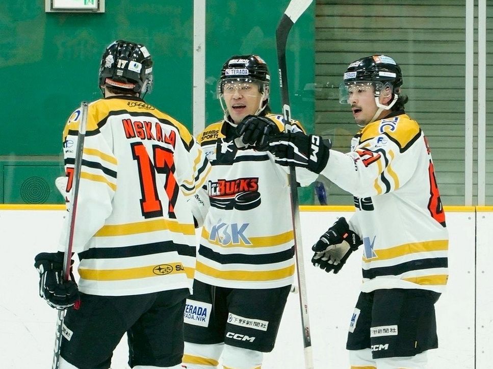 第2ピリオド7分19秒、バックスのFW古橋(中央)が得点を決め喜ぶ=尼崎スポーツの森アイススケートリンク