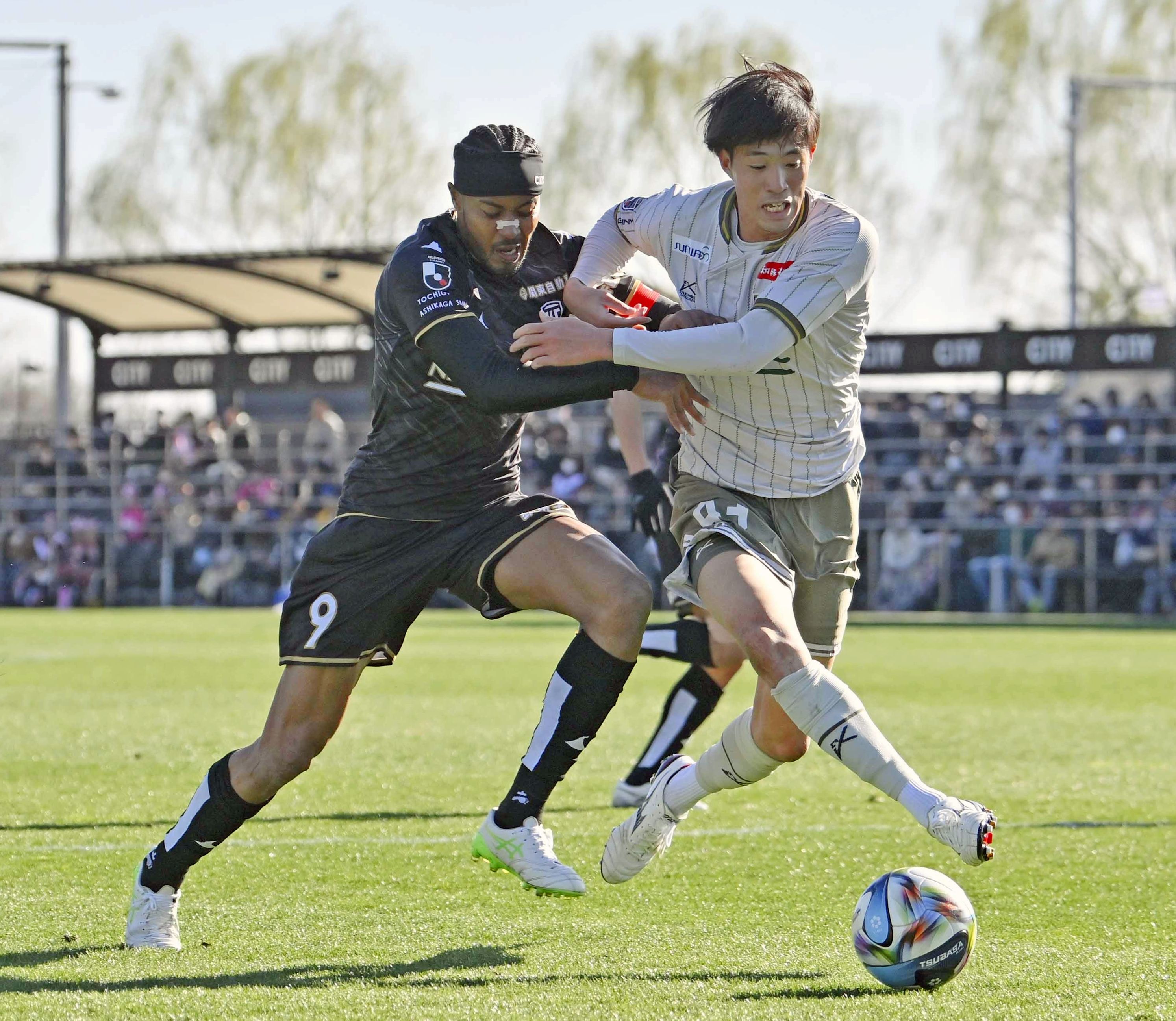 後半19分、栃木シティのFW西谷(右)がシュートを放つも相手に阻まれる=CFS、森田大地撮影