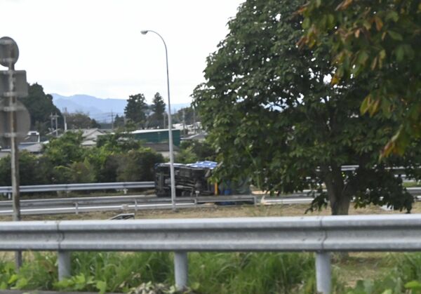 横転したトラック=13日午後1時10分、鹿沼市茂呂