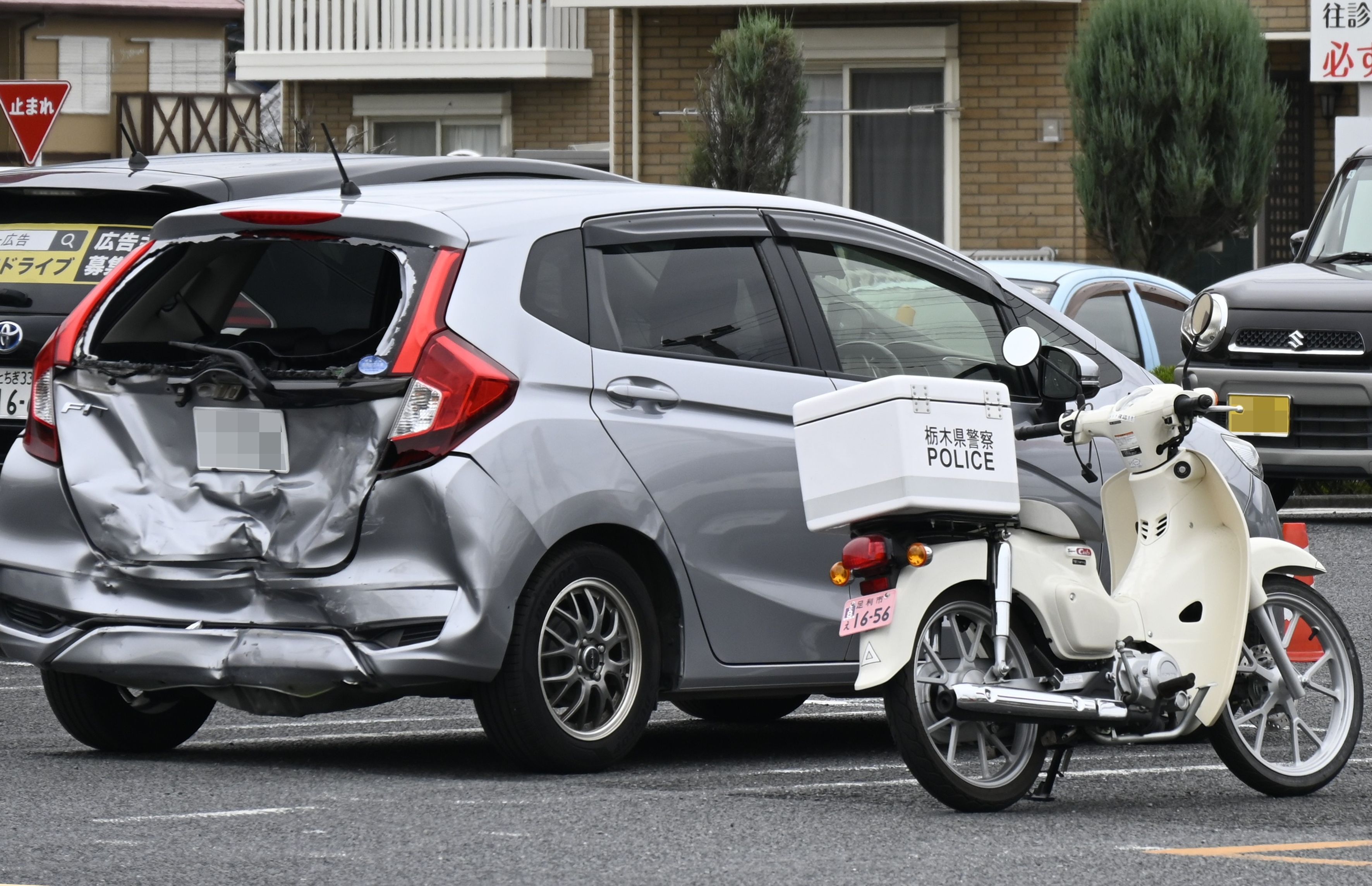 スーパー駐車場で起きた事故に巻き込まれた車=10日午後、足利市大前町(画像は一部加工しています)