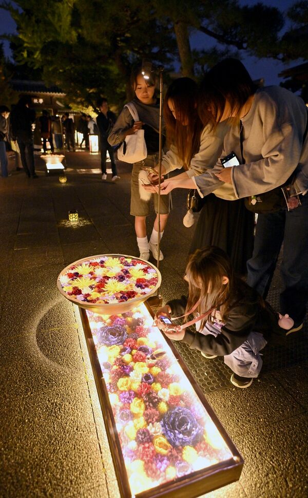 足利学校の参道を優しく照らすライトアップされた花手水=2日午後5時20分、足利市昌平町