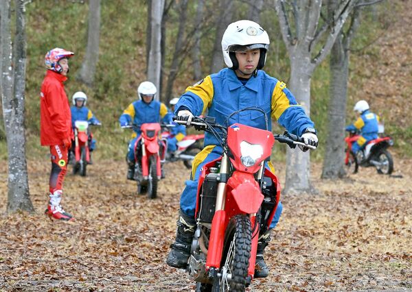 オフロード公開訓練会に臨む交通機動隊員ら=3日午前10時20分、茂木町林