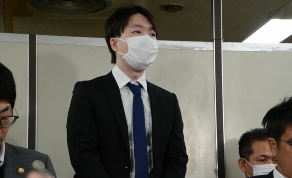 控訴審初公判後、記者会見で発言する三輪浦さん=2月9日、東京・霞が関の司法記者クラブ
