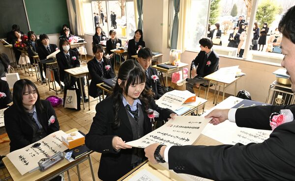 担任から卒業証書を受け取る生徒=2日午前11時50分、益子町塙