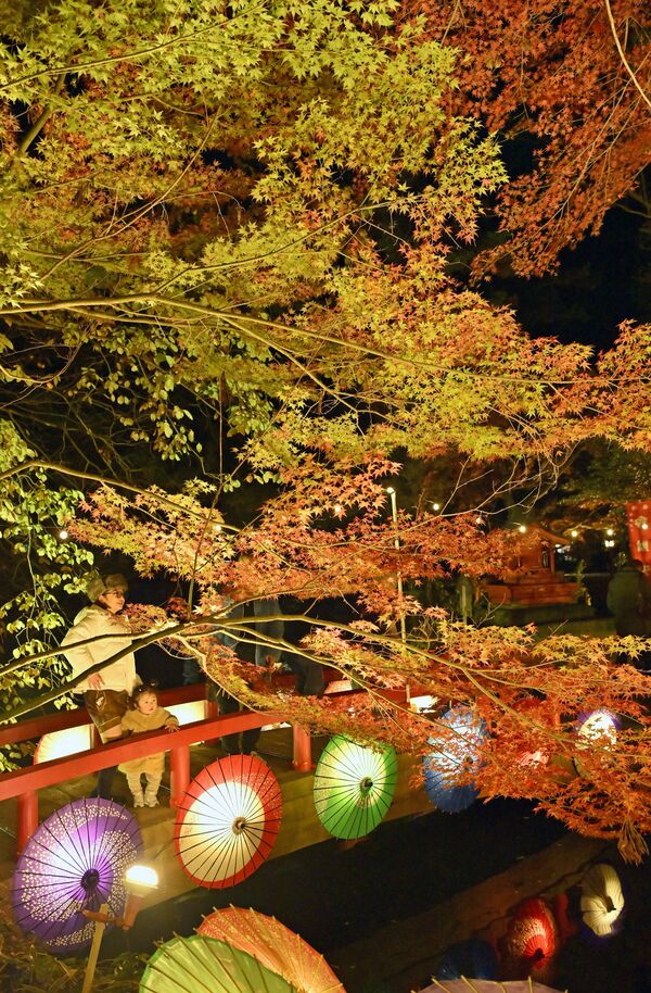 夜の水面に映る紅葉や和傘の光 小山・間々田八幡宮でライトアップ