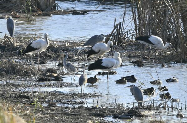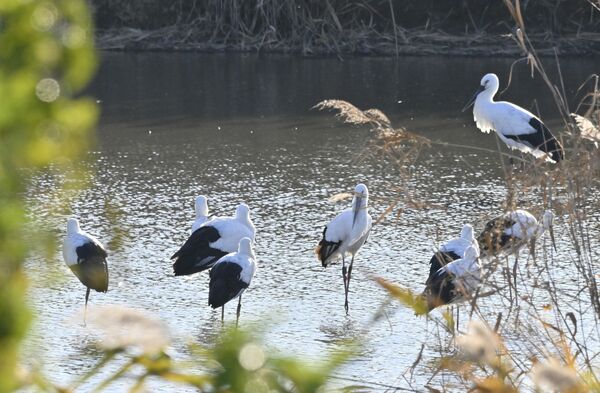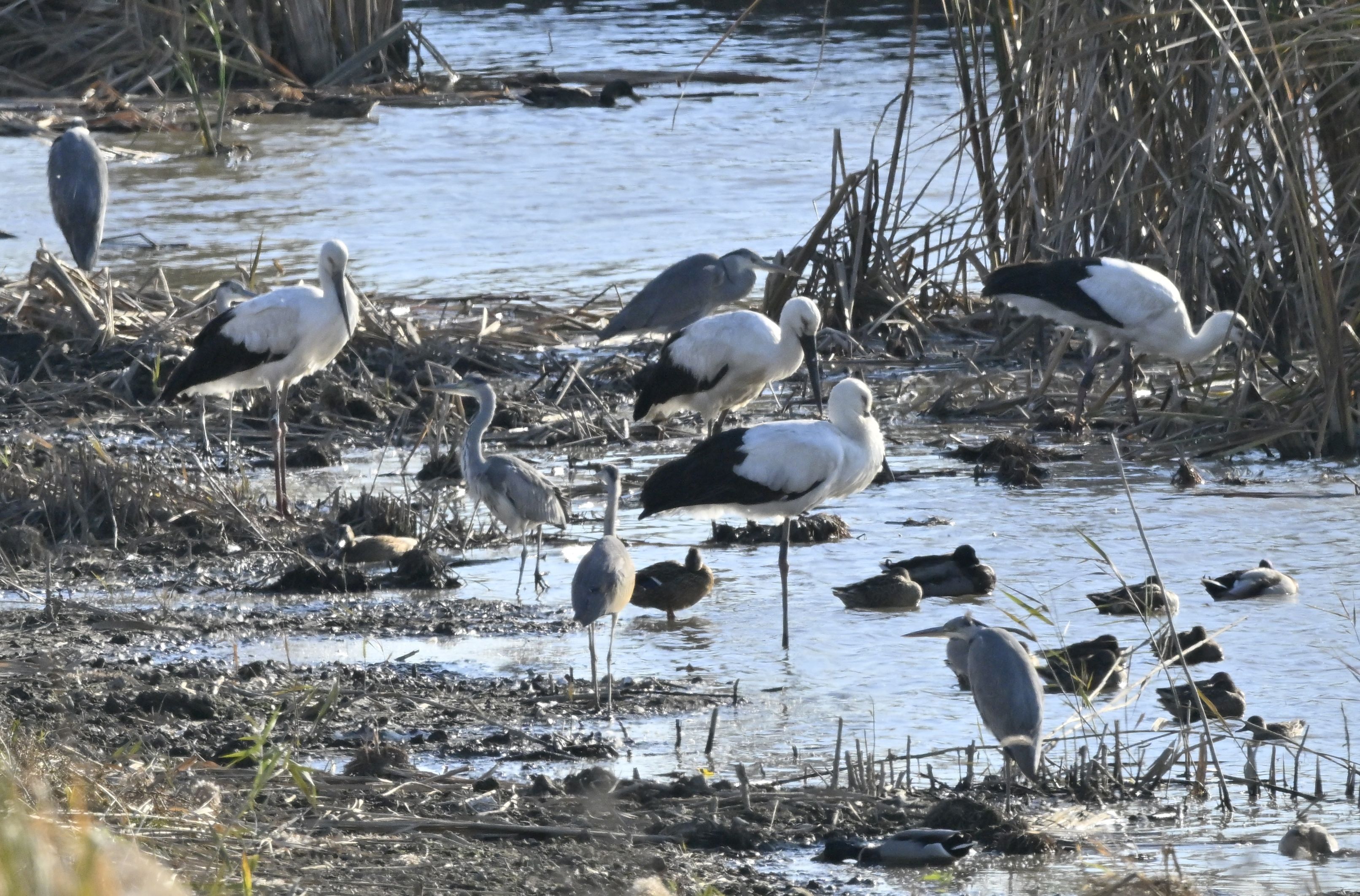 渡良瀬遊水地で餌をついばむコウノトリの群れ=19日午後4時、小山市下生井