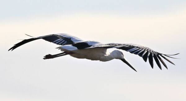 渡良瀬遊水池の上空を舞うコウノトリ=19日午後2時55分、小山市下生井