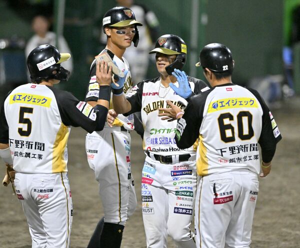 8回、栃木GBのダッタ(右から2人目)が満塁本塁打を放ち、本塁で出迎えられる=小山運動公園野球場、森田大地撮影