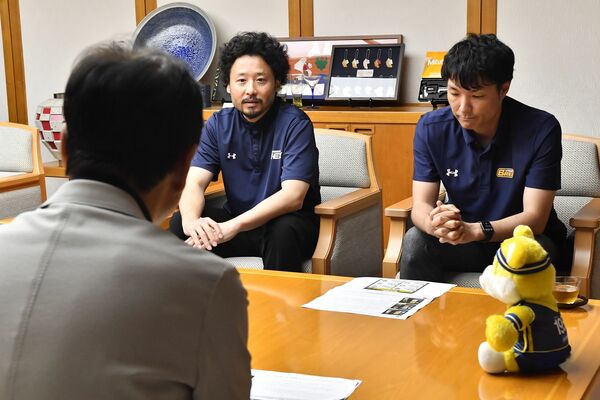 佐藤市長(手前)と歓談する藤本社長(右)と田臥主将=宇都宮市役所