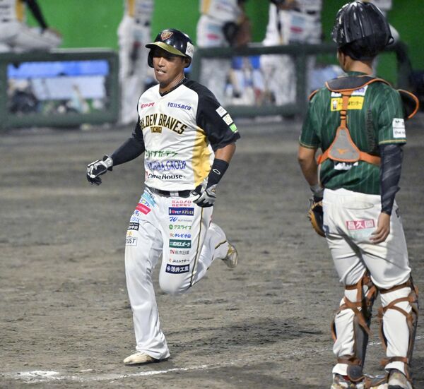 3回、栃木GBの田代の適時打と後逸の間に一走・菅野(左)が生還