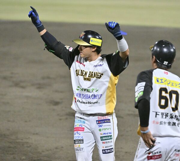 3回、栃木GBの鈴木(左)が勝ち越しとなる適時打を放ち、塁上で喜ぶ=小山運動公園野球場、森田大地撮影