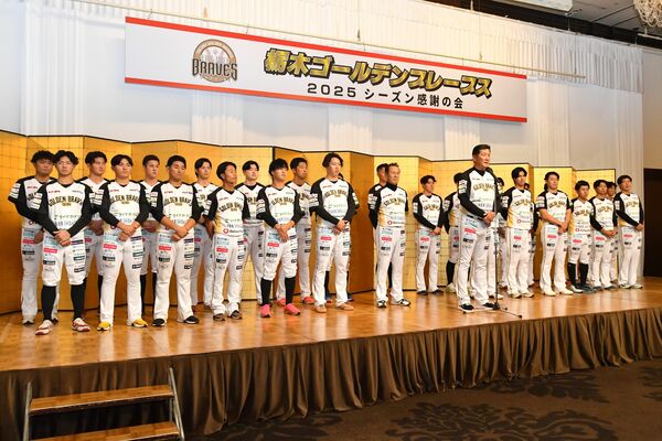スポンサーなどに感謝を伝える栃木GBの選手たち=宇都宮市内