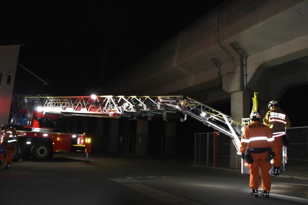 運転を見合わせた電車内からはしご車で移動困難者を救助した東武日光線の現場=11日午後8時40分、栃木市境町