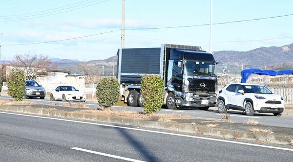 荷台の茶殻が飛散した大型トラック=4日午前8時55分、佐野市高橋町