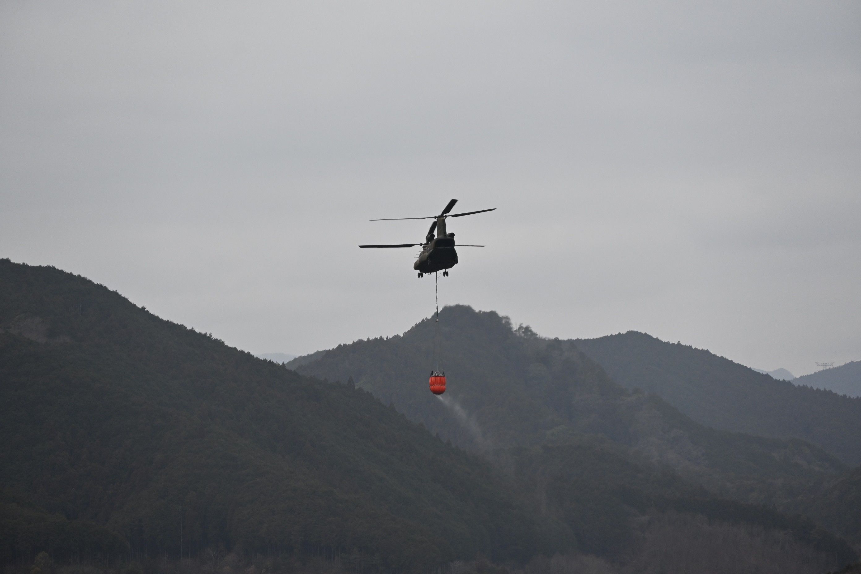 消火活動にあたる自衛隊ヘリ=24日午前10時5分、鹿沼市上南摩町