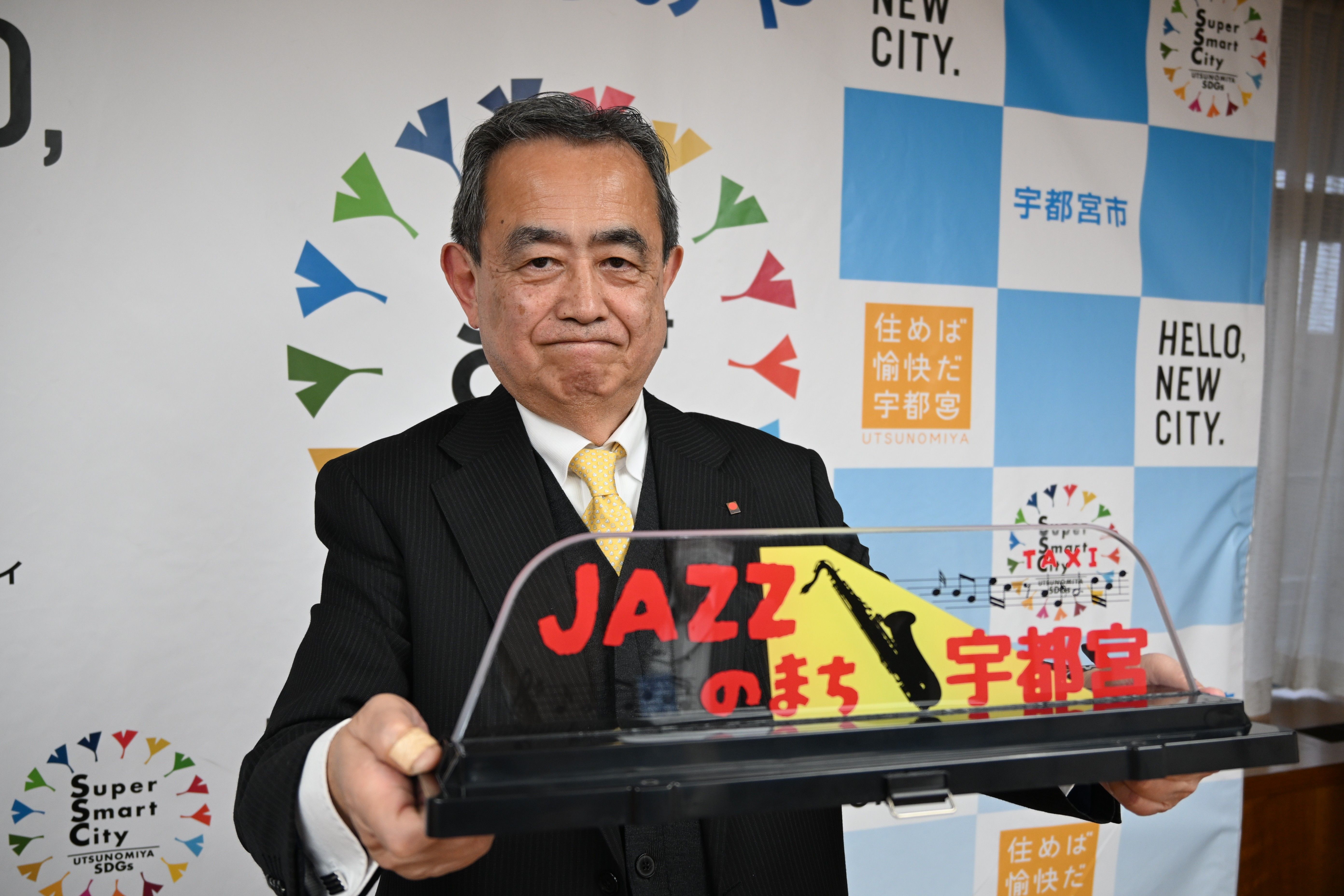 タクシーの上部に設置される表示灯を手にする鈴木代表取締役