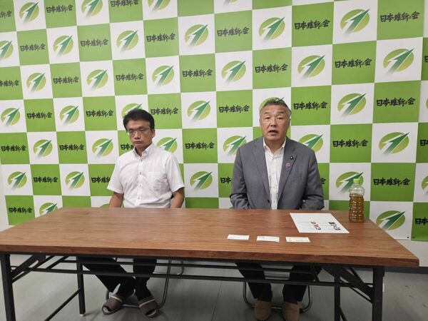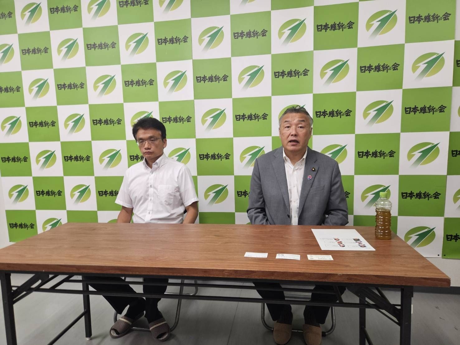 就任記者会見に臨む維新県総支部の井上英孝新代表(右)と続投が決まった柏倉幹事長=9月16日、宇都宮市内