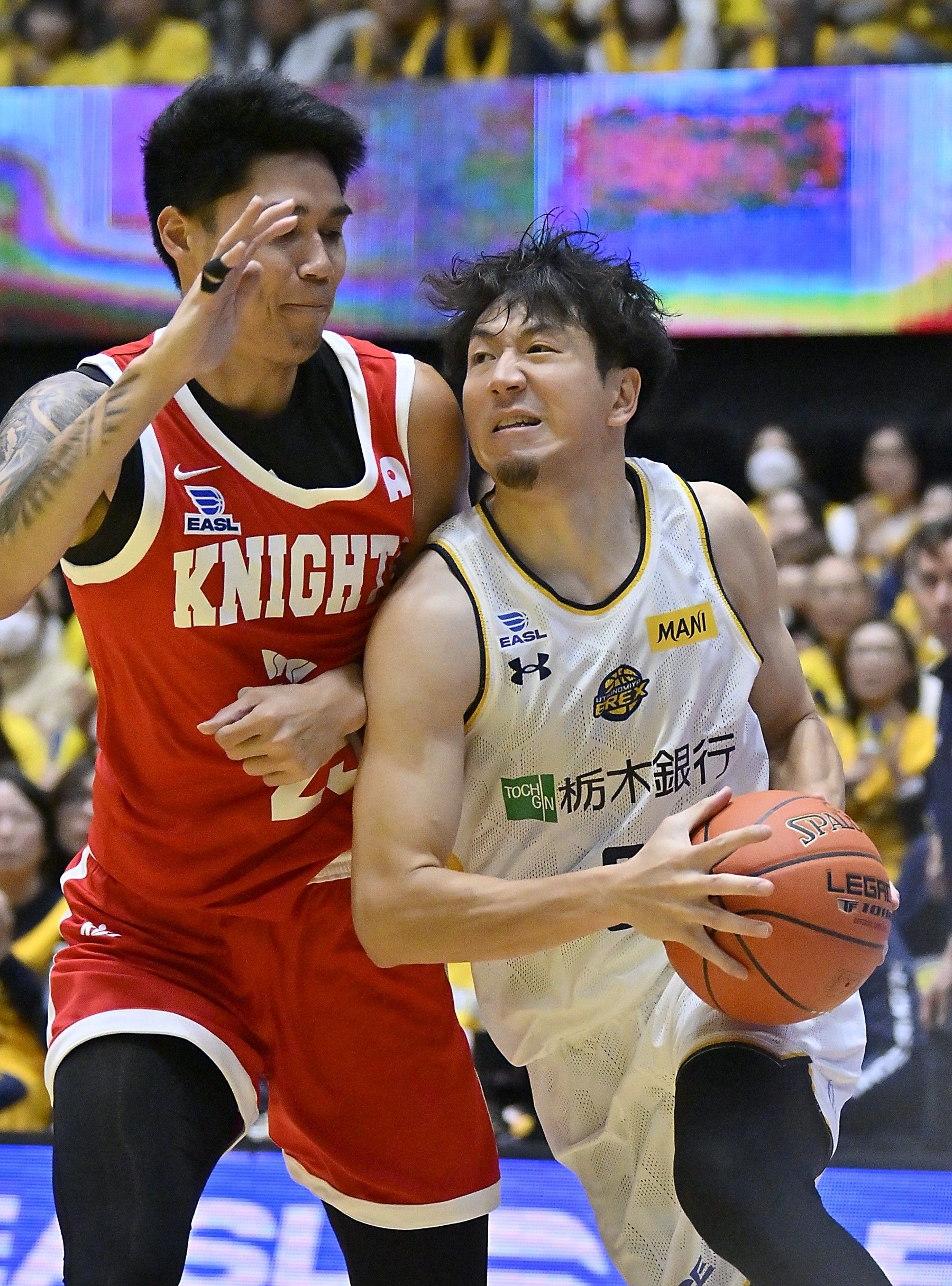 第1クオーター3分、ブレックスの比江島(右)がゴール下に攻め込む=ブレックスアリーナ宇都宮、広瀬華撮影