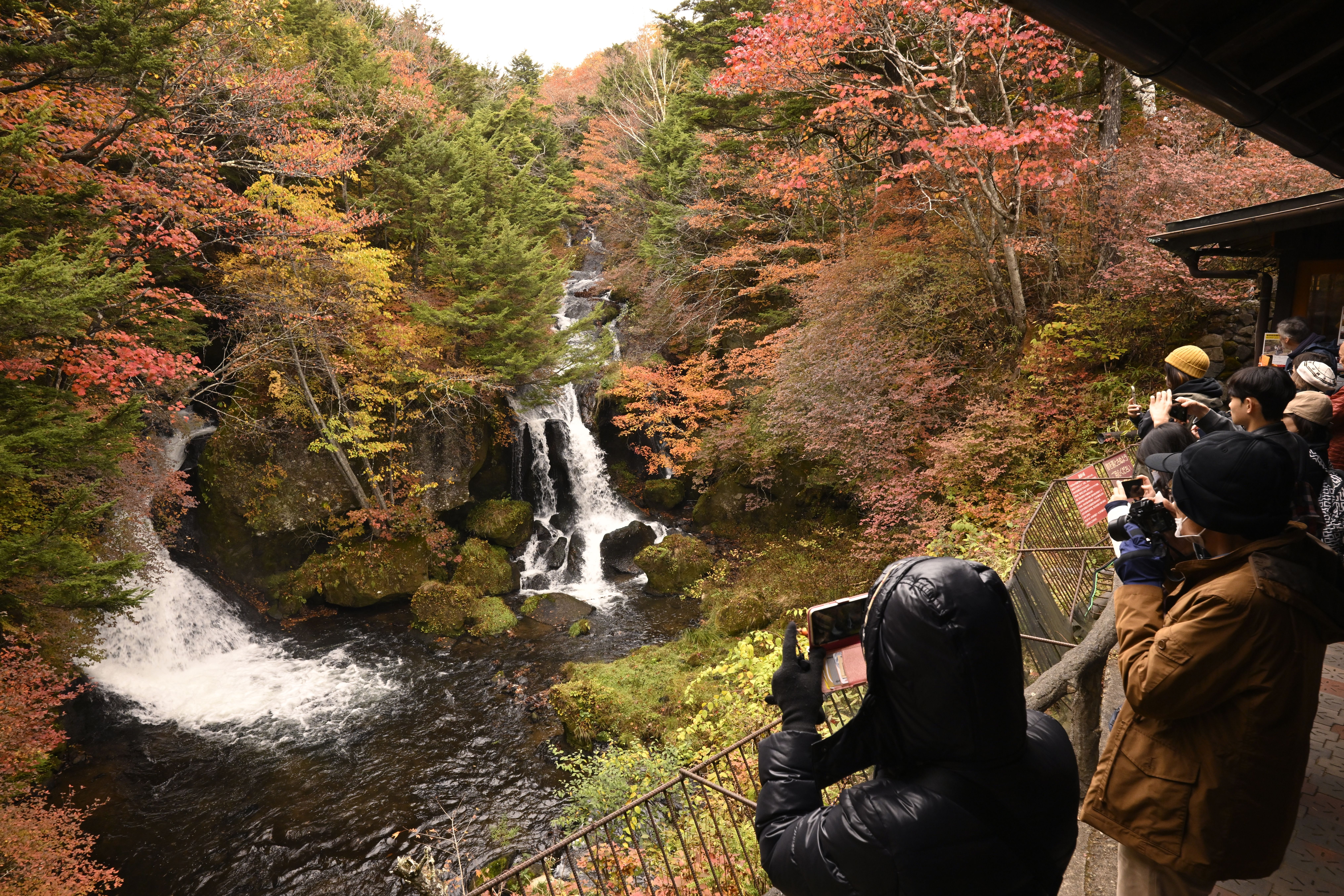 見頃を迎えた竜頭の滝の紅葉=22日午前10時50分、日光市中宮祠