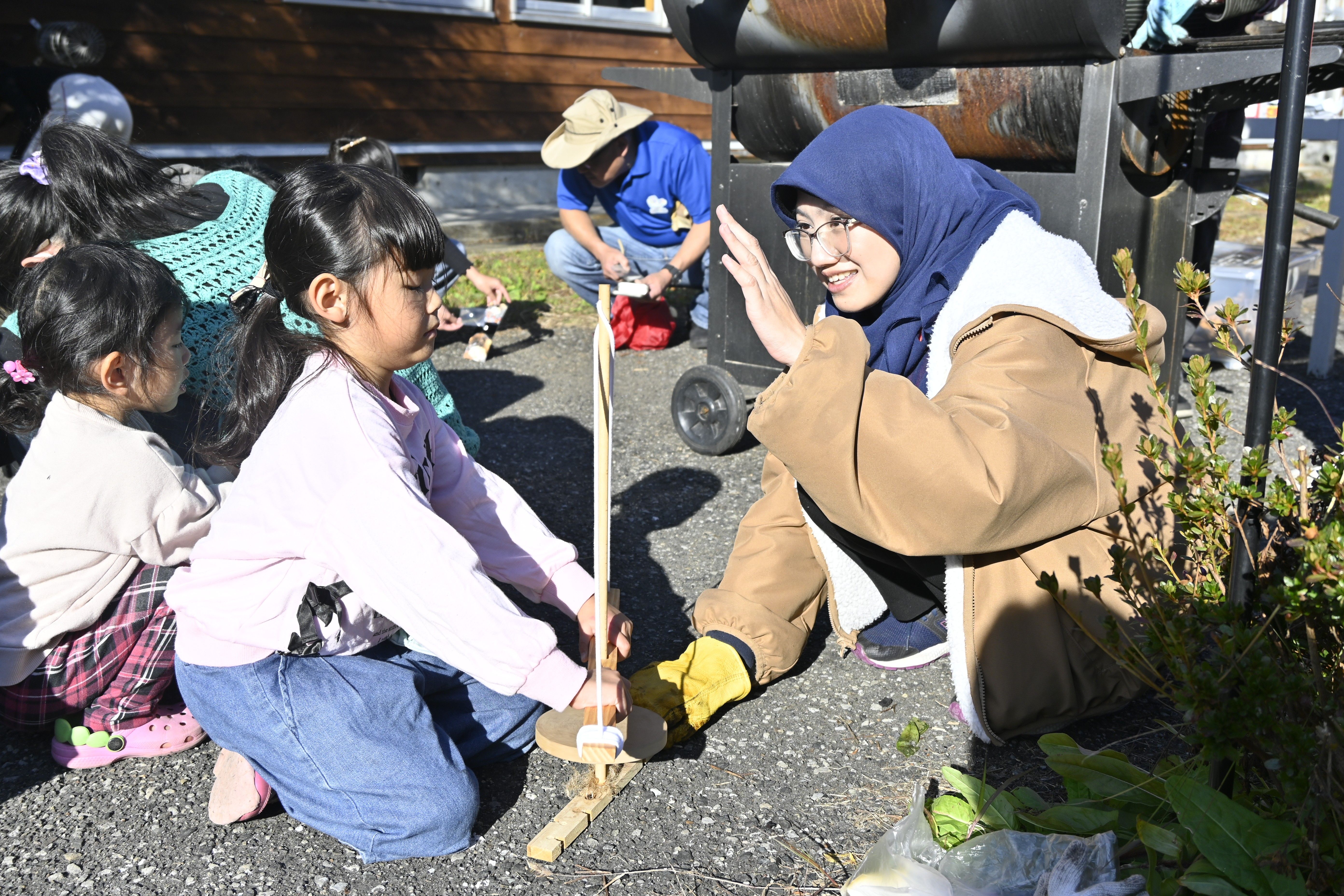 協力しながら火おこしを体験する参加者