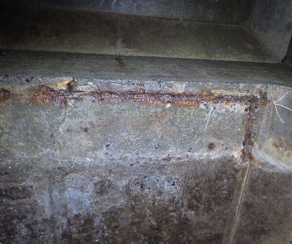 腐食により鉄筋が露出した下水道管内部(市提供)
