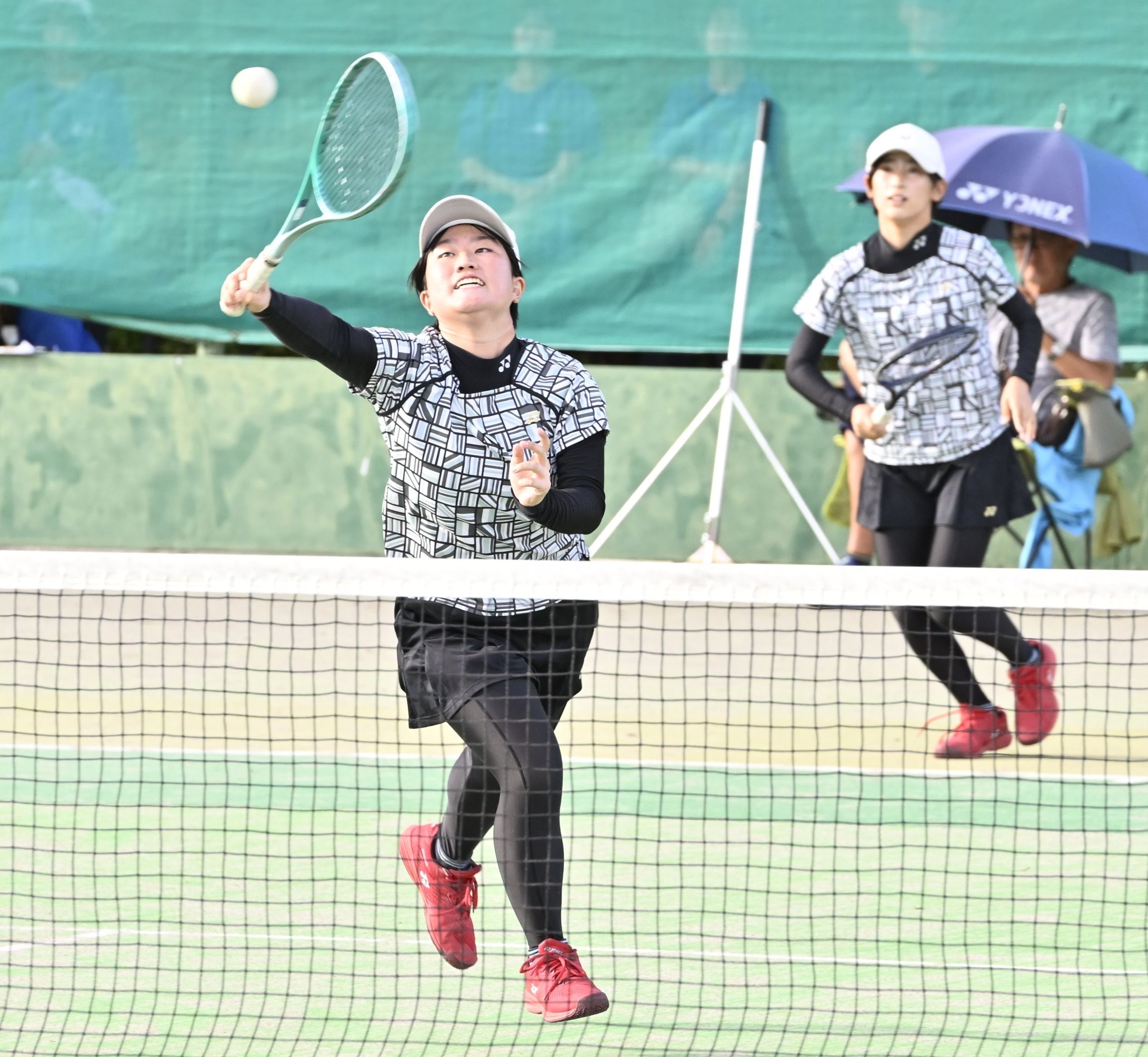 ソフトテニス女子団体決勝 白鴎足利の阿久津がボレーで得点する。右奥は螺良=栃木市総合運動公園テニスコート、加藤竜矢撮影