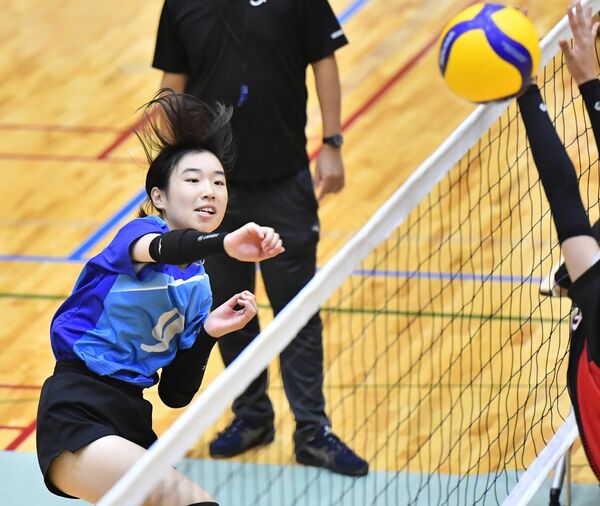 女子4回戦 第1セット、宇東の鷹家がスパイクを決める=県北体育館