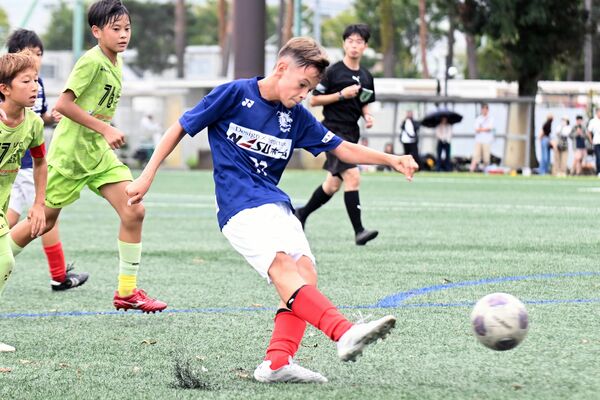 第1節 那須野ケ原ボンジボーラ-ISO SC戦 後半9分、那須野ケ原ボンジボーラのオタビオがシュートを決める=県グリーンスタジアムサブグラウンド