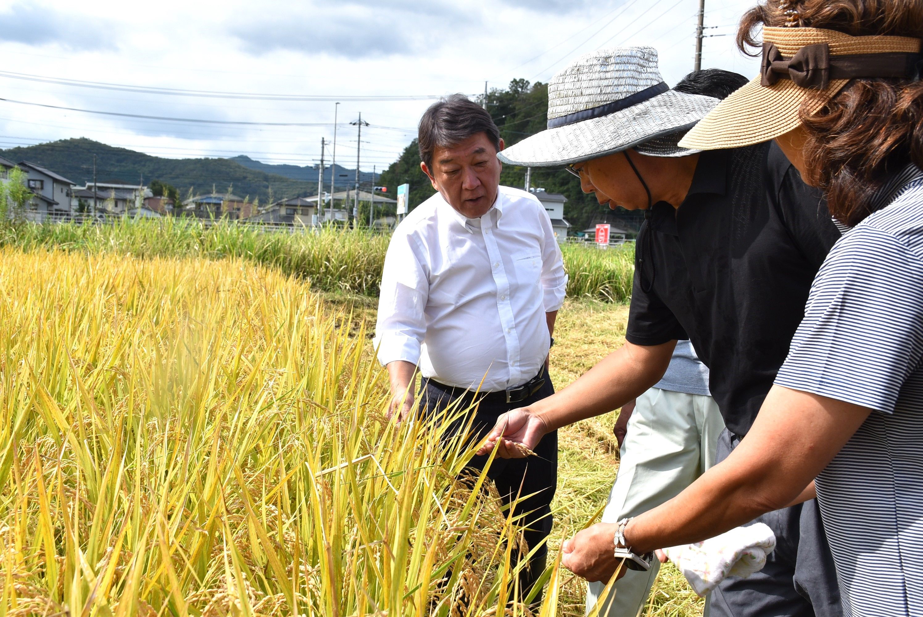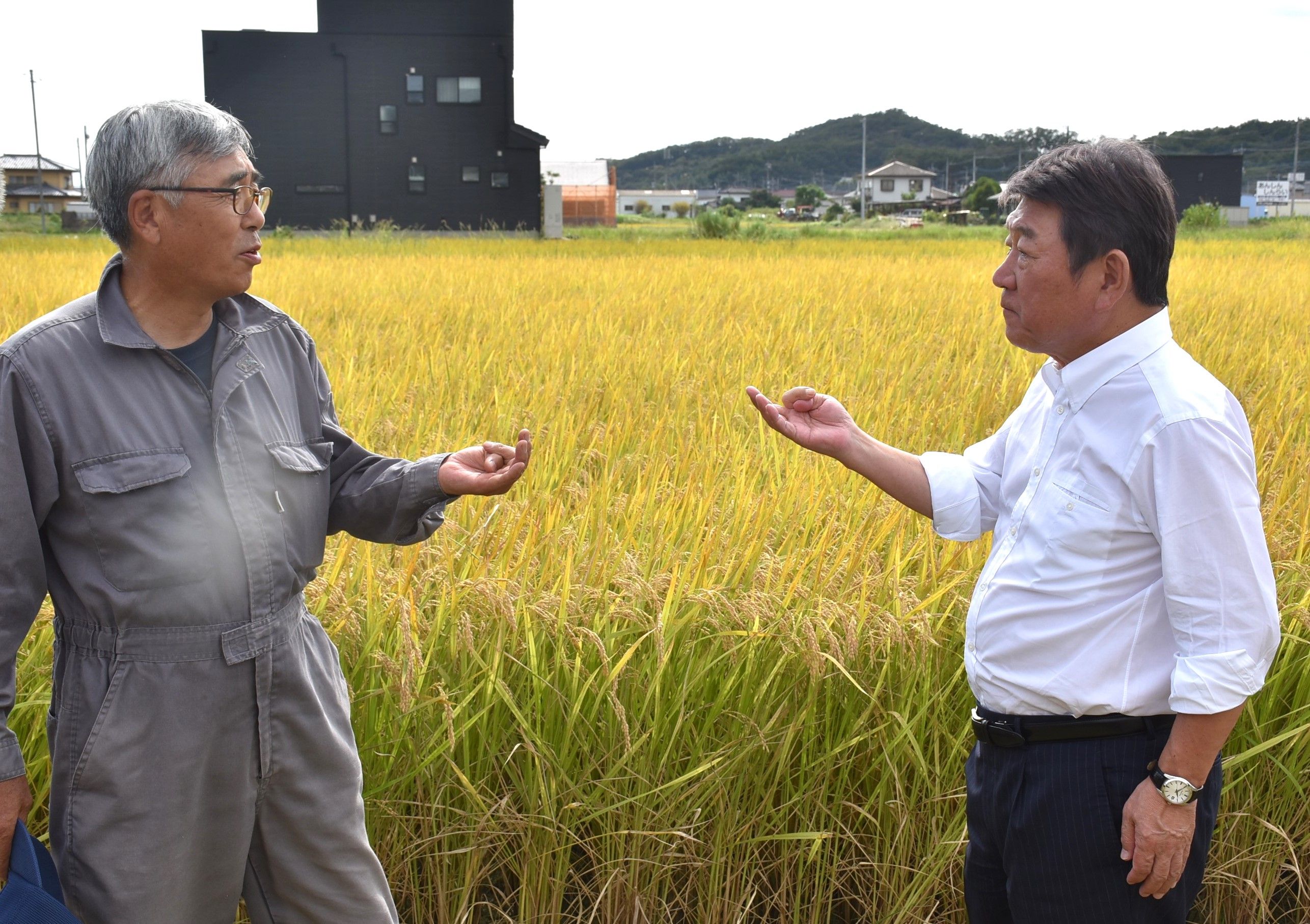 コメの生産現場を視察する茂木氏(左)=15日午後、足利市大月町