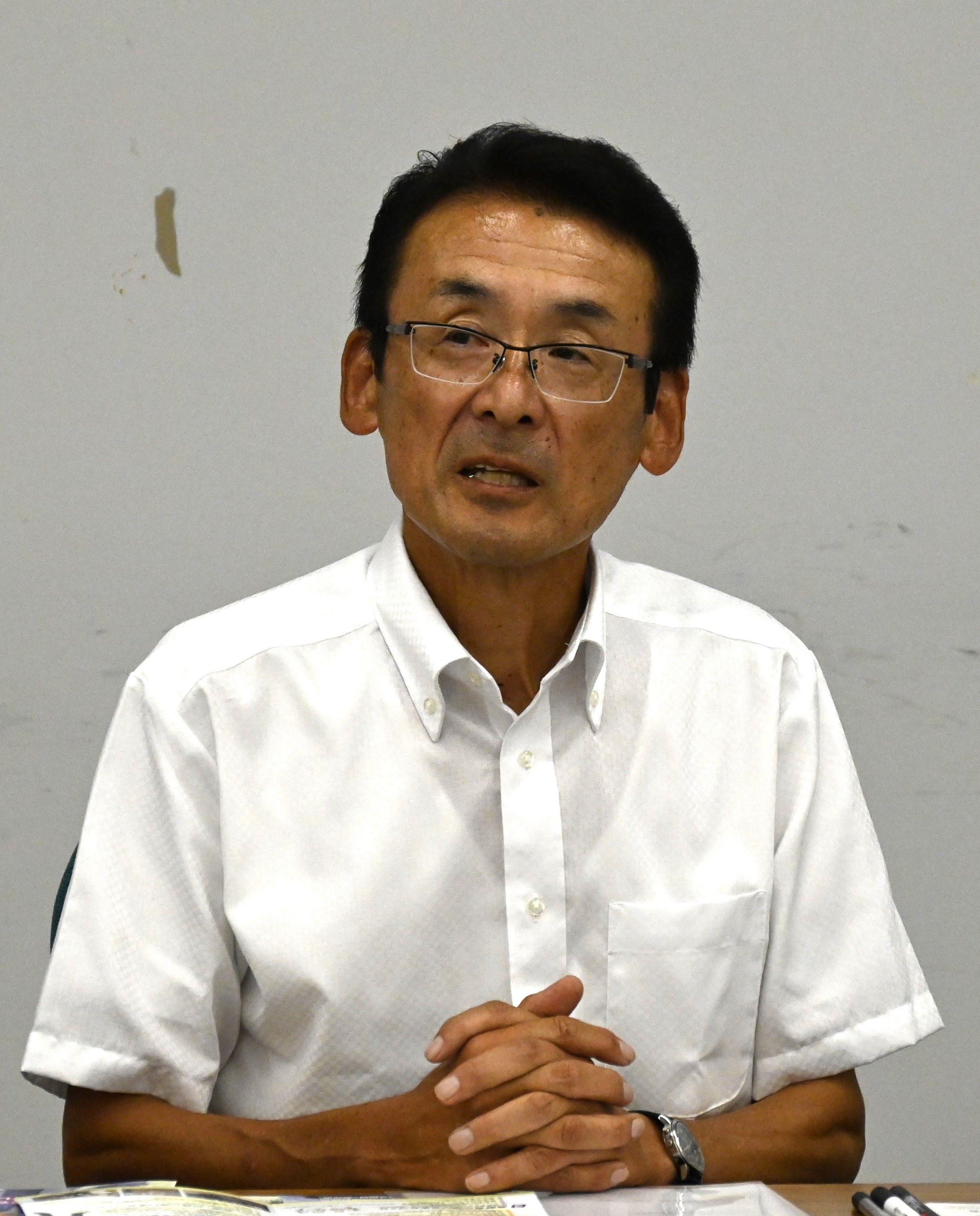 市貝町長選出馬を正式に表明する小塙氏=16日午前、県庁