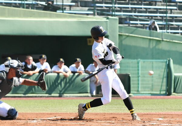 7回、石橋の古谷が2点適時三塁打を放つ=清原、内藤大地撮影