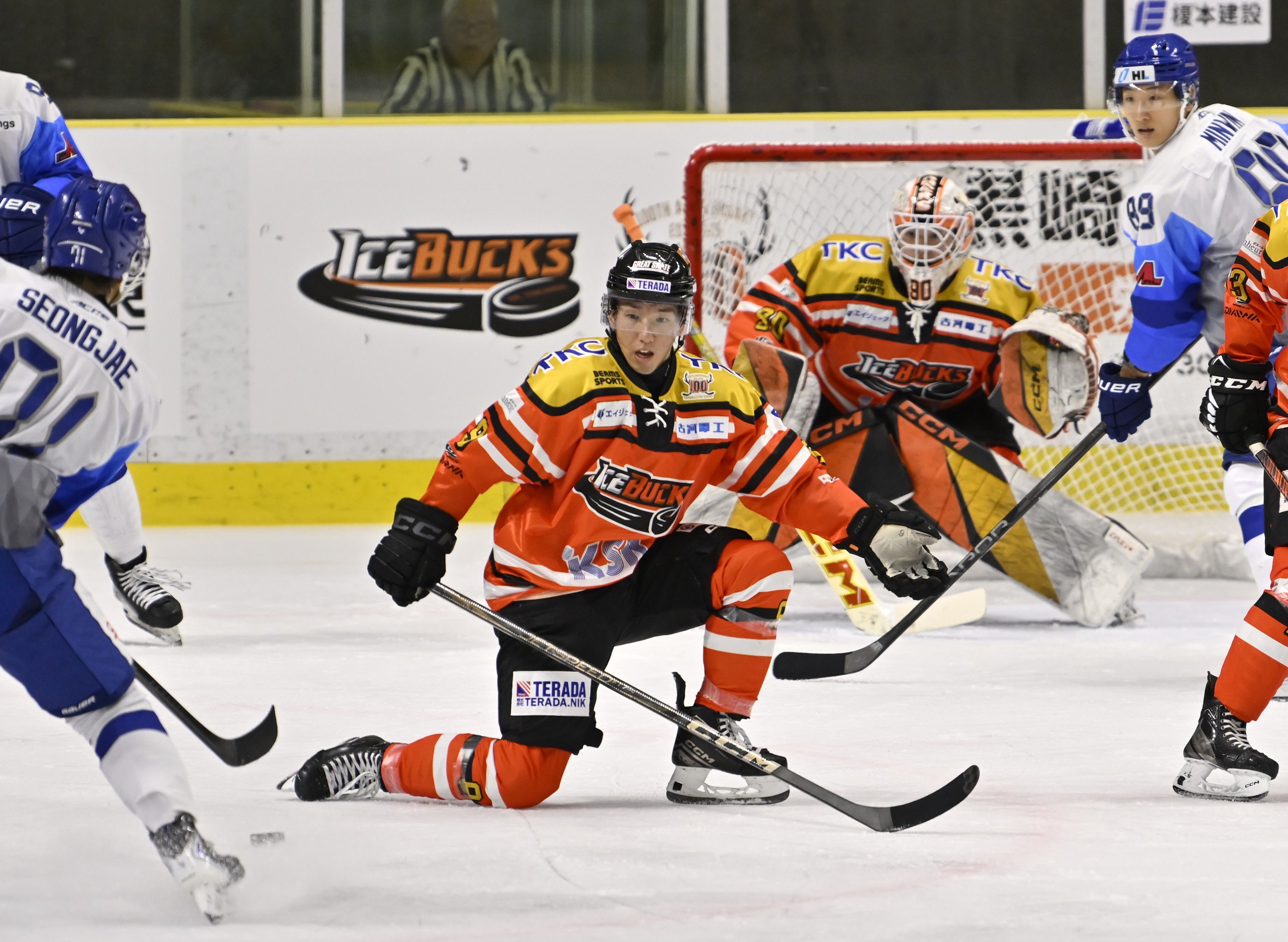 第2ピリオド13分、反則で数的不利となり、懸命にゴールを守るバックスのDF佐藤(中央)ら=日光霧降アイスアリーナ、森田大地撮影
