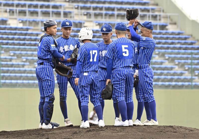 2回、2死二、三塁のピンチでマウンドに集まる青藍泰斗ナイン=エイジェックスタジアム、加藤竜矢撮影