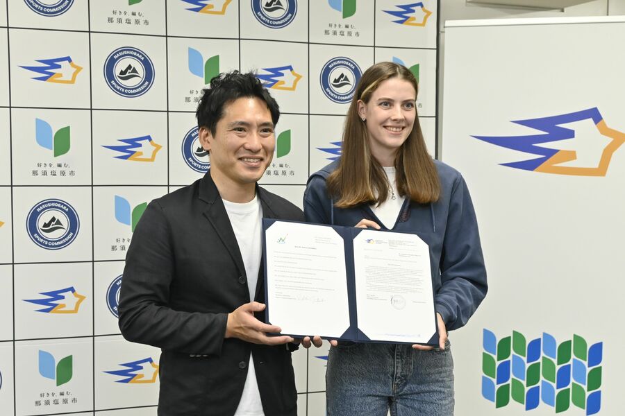フォトセッションに臨む渡辺那須塩原市長(左)とマフチク選手=5月14日午後、東京都内